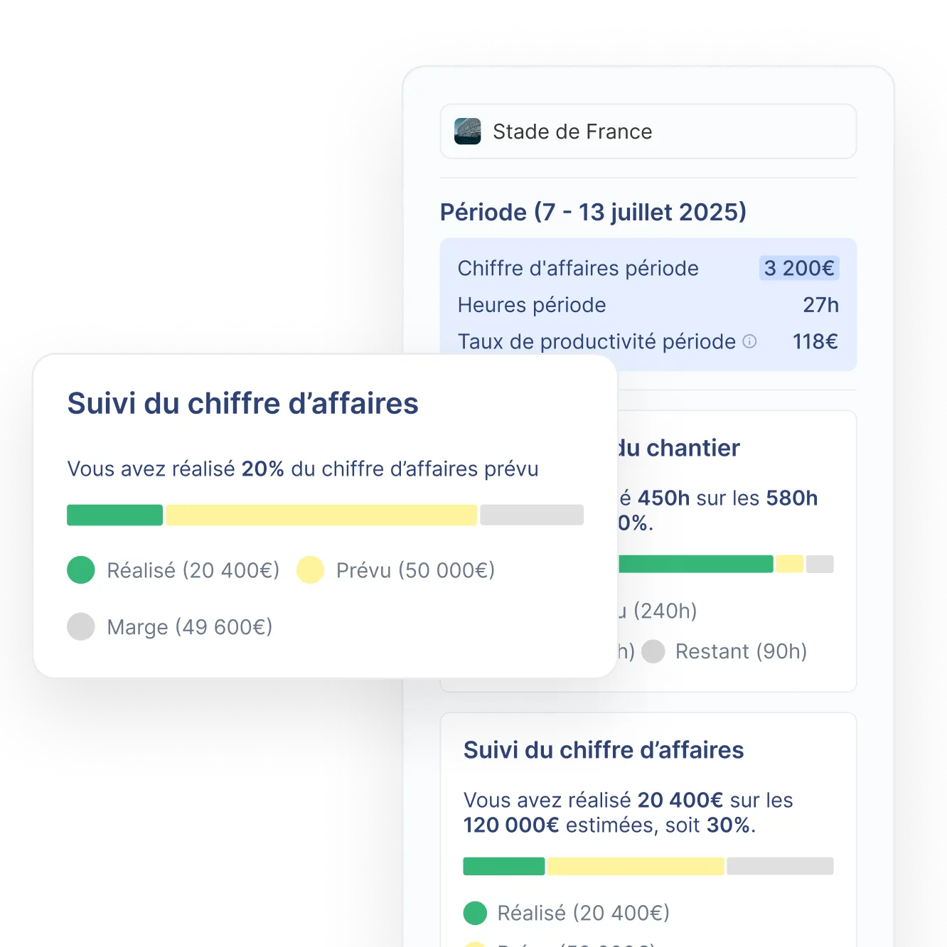 Pilotez votre chiffre d'affaires par chantier en temps réel. Suivez la production, anticipez les dérives. Toutes les données au même endroit, sans surprises en fin de chantier.